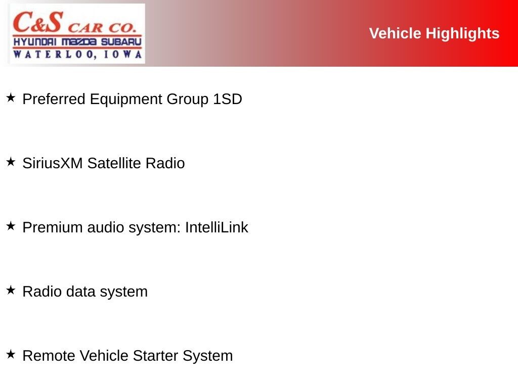 120-Volt Power Outlet, 18" Aluminum Wheels, 6-Way Power Driver Seat Adjuster, Apple CarPlay/Android Auto, Cloth w/Leatherette Seat Trim, Driver's Seat Mounted Armrest, Front Bucket Seats, Front Fog Lamps, Power driver seat, Power Tilt-Sliding Moonroof, Preferred Equipment Group 1SD, Premium audio system: IntelliLink, Radio data system, Rear Cross-Traffic Alert, Remote Vehicle Starter System, Side Blind Zone Alert, SiriusXM Satellite Radio.
