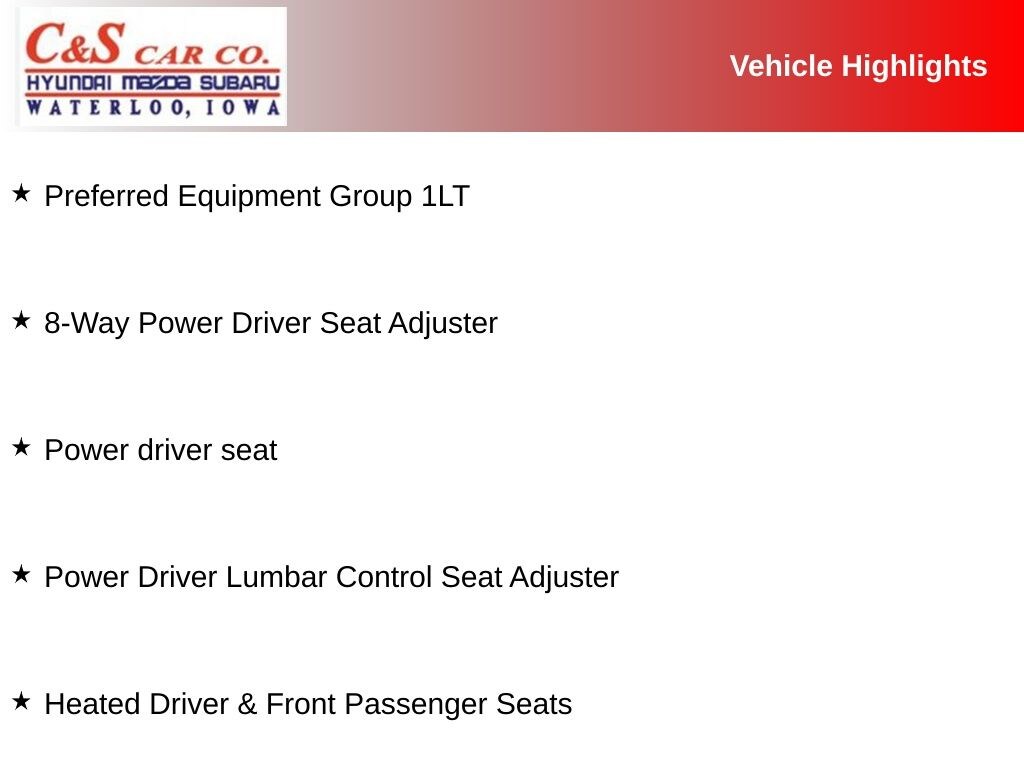 8-Way Power Driver Seat Adjuster, Heated Driver & Front Passenger Seats, Heated front seats, Power Driver Lumbar Control Seat Adjuster, Power driver seat, Preferred Equipment Group 1LT, Split folding rear seat.