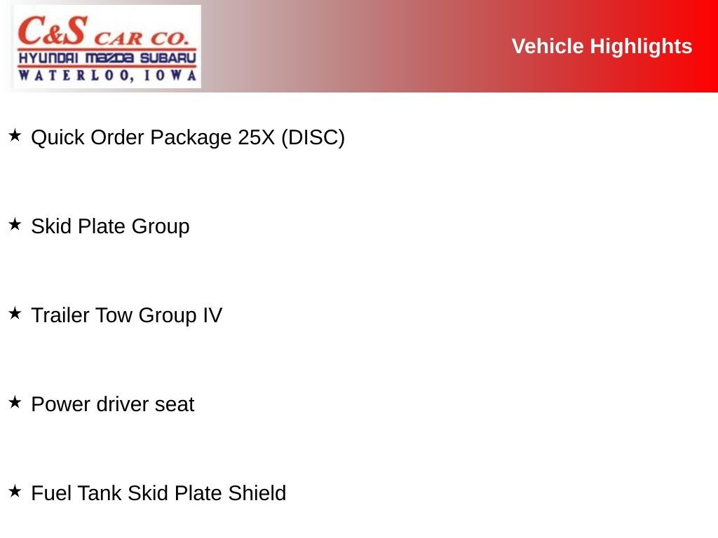 7 & 4 Pin Wiring Harness, Apple CarPlay/Android Auto, Class IV Receiver Hitch, Fuel Tank Skid Plate Shield, Heated door mirrors, Power driver seat, Quick Order Package 25X (DISC), Skid Plate Group, Trailer Tow Group IV, Wheels: 18" x 8.0" Painted Aluminum.