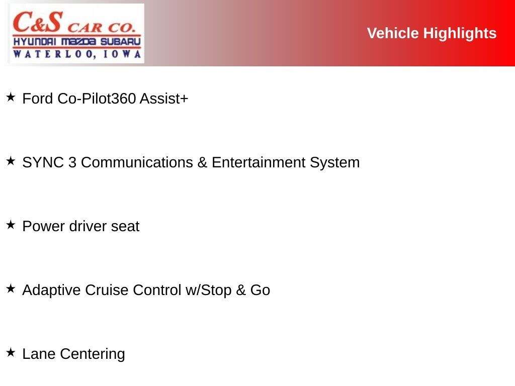 - Ford Co-Pilot360 Assist+, including Evasive Steering Assist, Voice-Activated Touchscreen Navigation System, Adaptive Cruise Control with Stop & Go, and Lane Centering