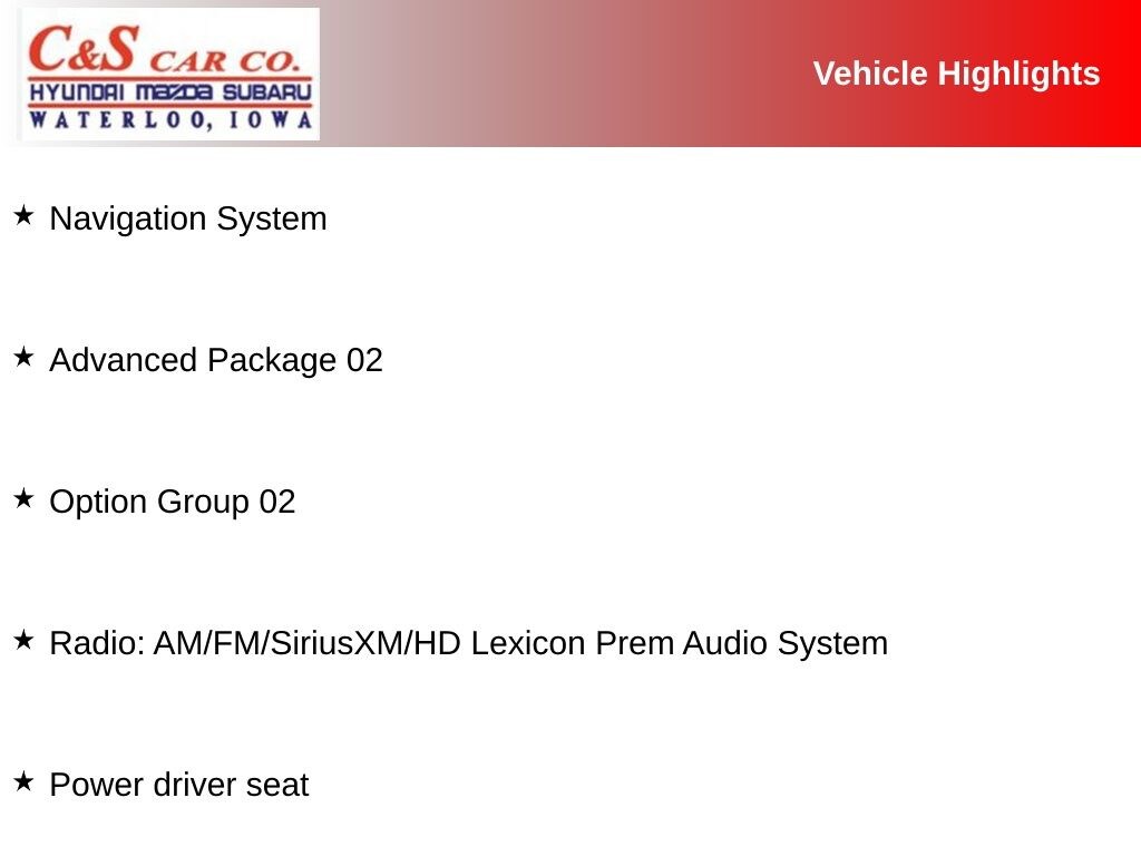 Advanced Package 02, Blind-Spot View Monitor, Heated & Ventilated Front Bucket Seats, Heated front seats, Leather Seating Surfaces, Leatherette Seating Surfaces, Memory seat, Monobloc Front Brakes, Navigation System, Option Group 02, Power driver seat, Power Liftgate, Power moonroof, Power passenger seat, Radio: AM/FM/SiriusXM/HD Lexicon Prem Audio System, Rear Parking Collision-Avoidance Assist, Remote Smart Parking Assist, Split folding rear seat, Surround View Monitor, Ventilated front seats, Wheels: 20" x 8.5J Alloy.