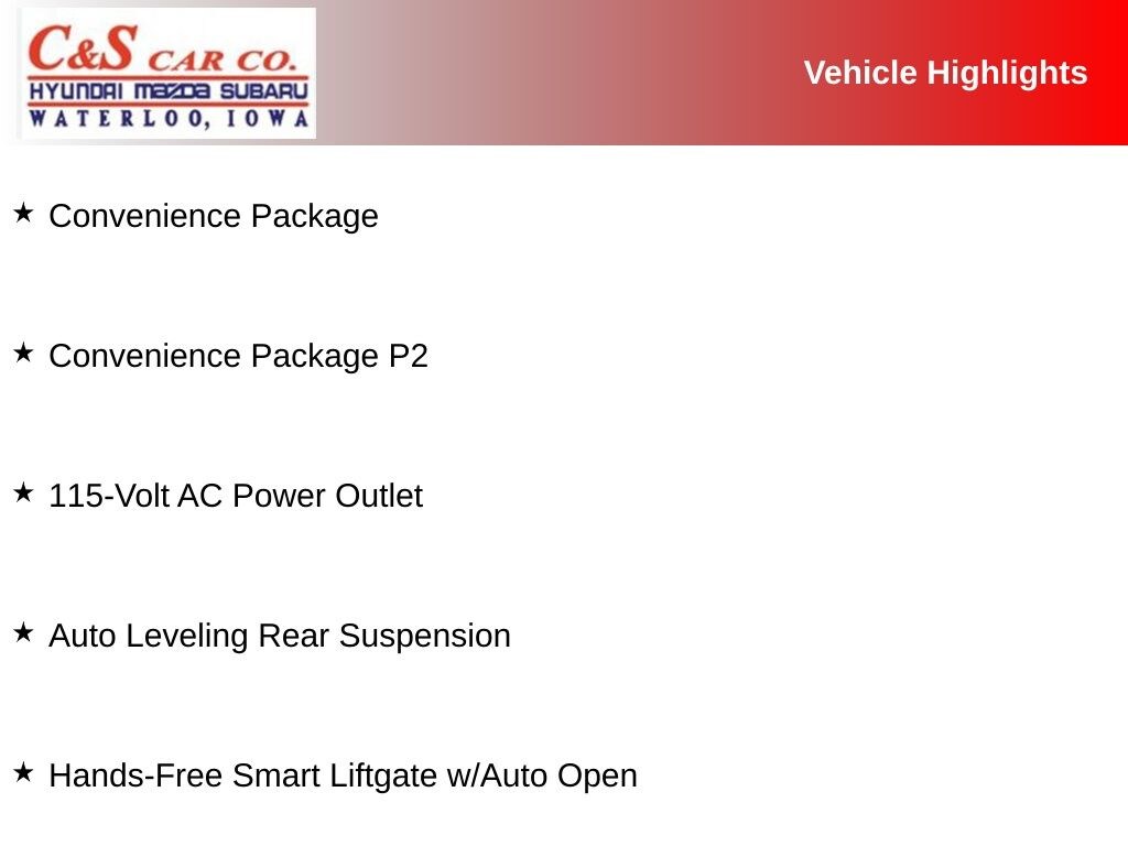 115-Volt AC Power Outlet, 3rd Row USB Outlets, 7" High Resolution Cluster Display, Auto Leveling Rear Suspension, Convenience Package, Convenience Package P2, Hands-Free Smart Liftgate w/Auto Open, LED Taillights, Parking Distance Warning - Forward, Power Sunroof P5, Rear Side Window Sunshades, Ultrasonic Rear Seat Occupant Minder, Wheels: 20"x 7.5J Split 5-Spoke Machined Alloy, Wireless Phone Charger.