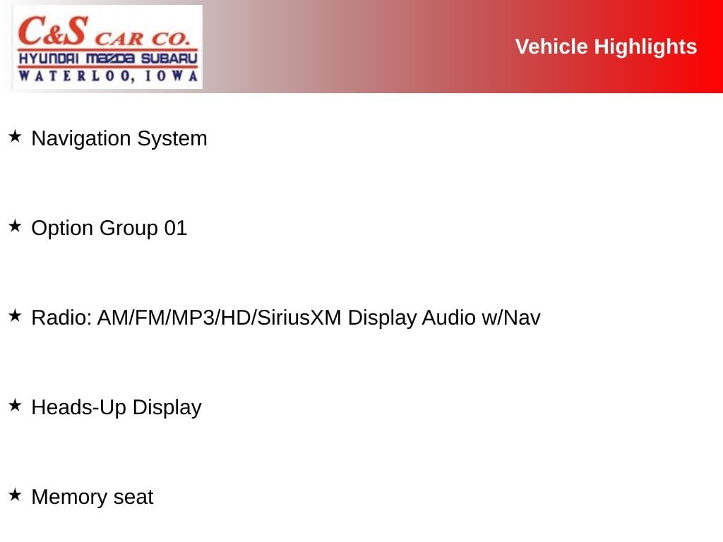 - Radio: AM/FM/MP3/HD/SiriusXM Display Audio w/Nav