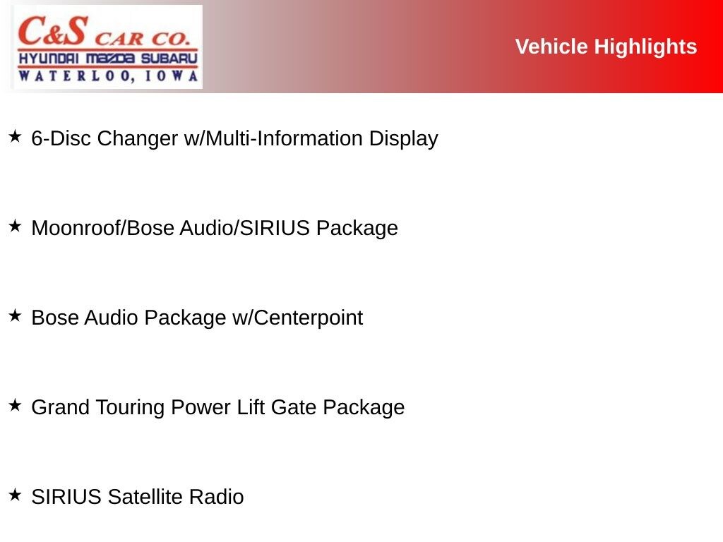 6-Disc Changer w/Multi-Information Display, Bose Audio Package w/Centerpoint, Grand Touring Power Lift Gate Package, Moonroof/Bose Audio/SIRIUS Package, Power Open & Close Hatch, Power Sliding Glass Moonroof w/Interior Sunshade, Rear-View Camera, SIRIUS Satellite Radio.