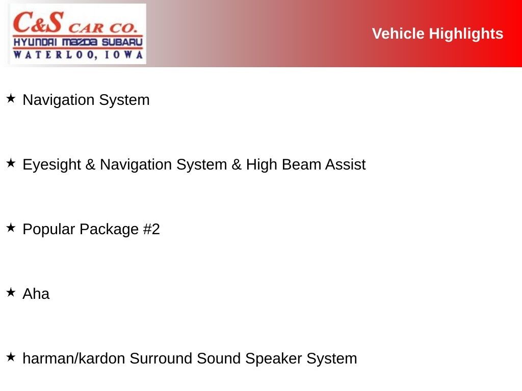 Aha, All Weather Floor Mats, Cargo Tray, Exterior Auto Dimming Mirror w/Approach Light/BSD, Eyesight & Navigation System & High Beam Assist, harman/kardon Surround Sound Speaker System, High Beam Assist, High-Intensity Discharge Headlights, Navigation System, Popular Package #2, Radio: Subaru Starlink 7.0" Multimedia Nav System, Rear Bumper Applique (0GS), Reverse Auto Brake, Smartphone Integration, Splash Guards, Vehicle Information Display.