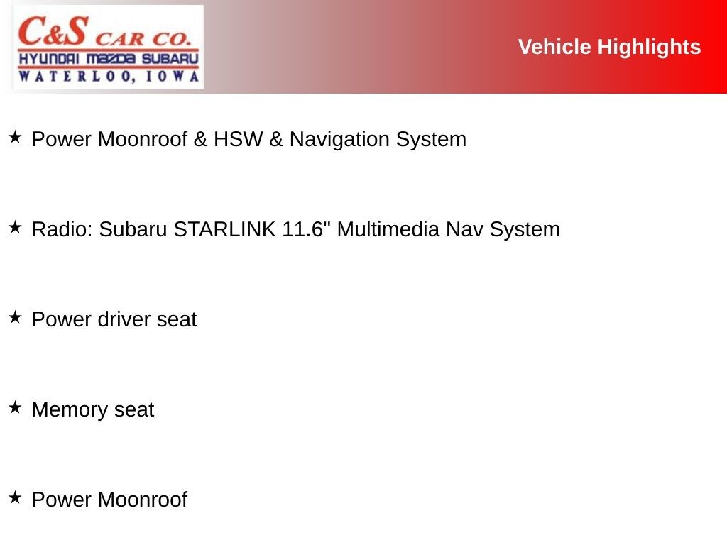 - Radio: Subaru STARLINK 11.6" Multimedia Nav System